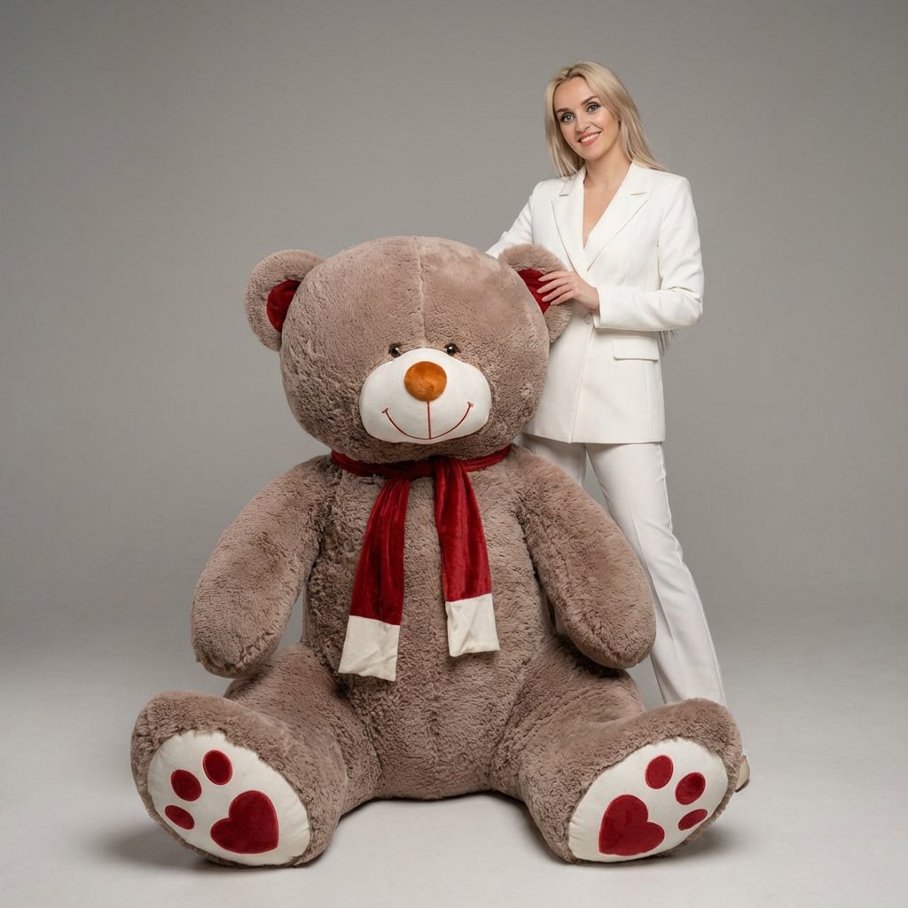 - Широкий выбор размеров и цветовой гаммы. У нас есть и маленькие плюшевые мишки, и гиганты до 250 см, а также плюшевые медведи с сердцем и вышивкой для романтических подарков.