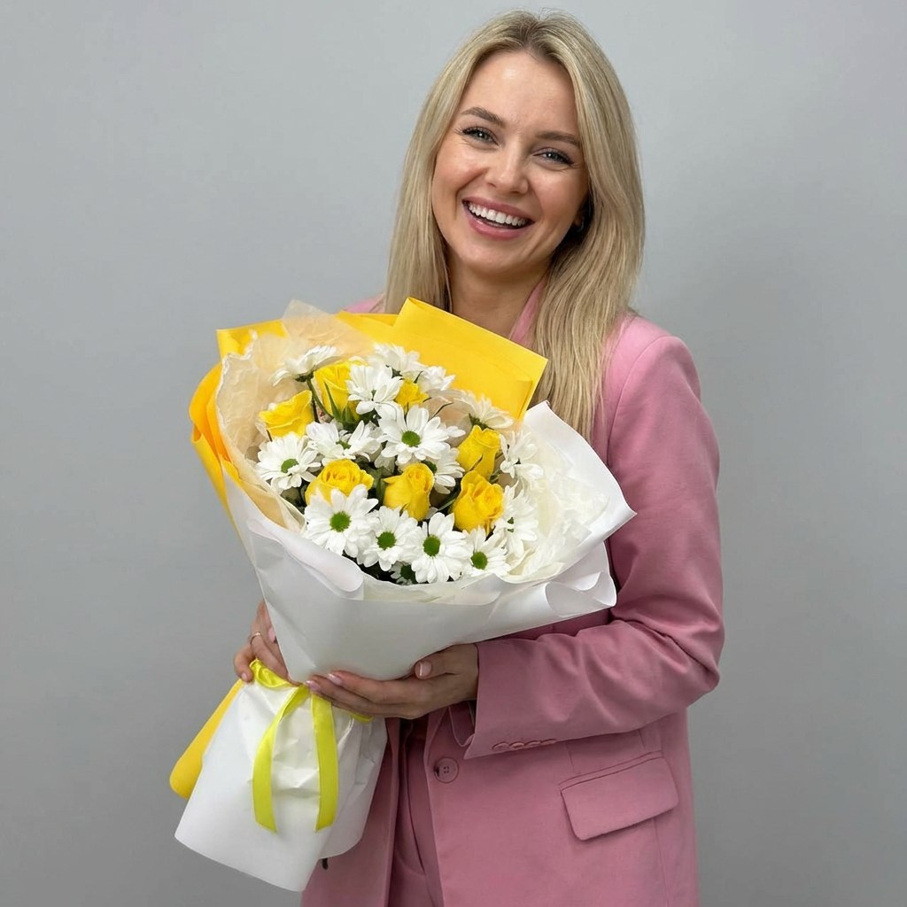 Подарите яркие эмоции и солнечное настроение вместе с нашим оригинальным букетом из кустовых хризантем-ромашек и импортных желтых роз! Такой букет — универсальный выбор для любого повода: день рождения, признание в симпатии, благодарность или просто чтобы сделать чей-то день особенным.