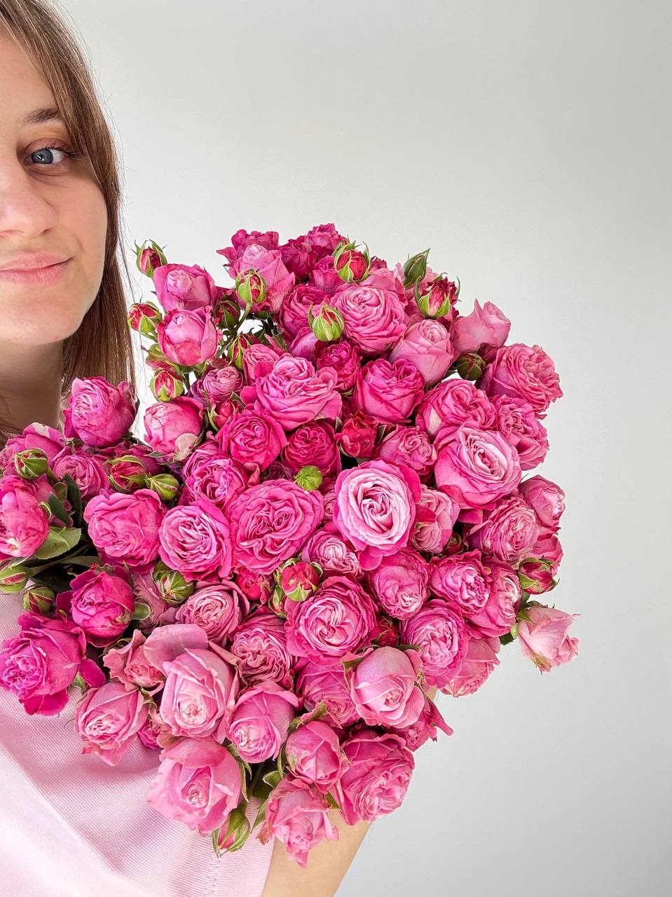 Если вы ищете букет, который выглядит пышно, ярко и очень обаятельно, то вы его нашли. Это – 5 веточек сочных малиновых кустовых роз.