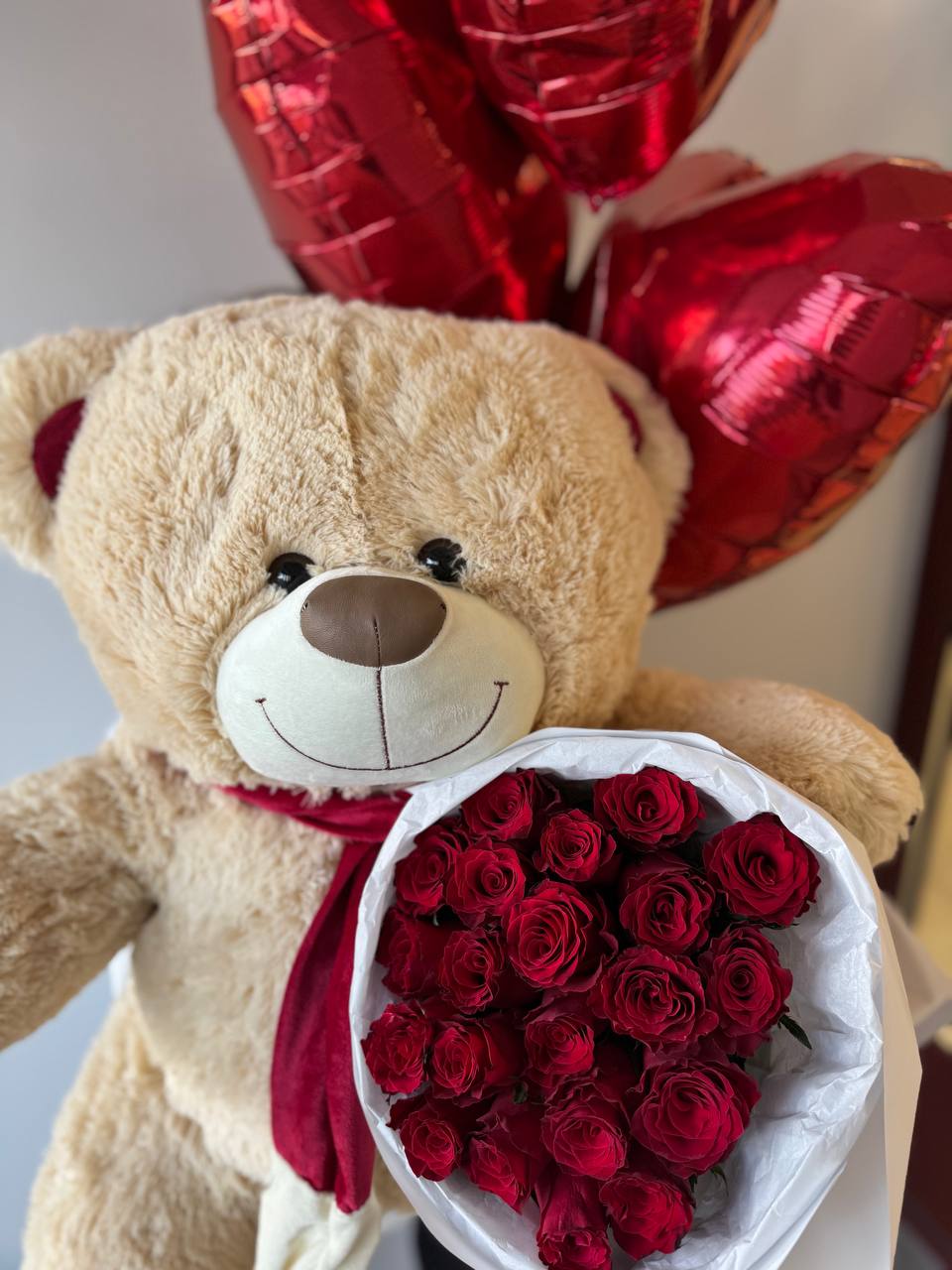 Набор: плюшевый мишка, букет роз и гелиевые шары Сердце: