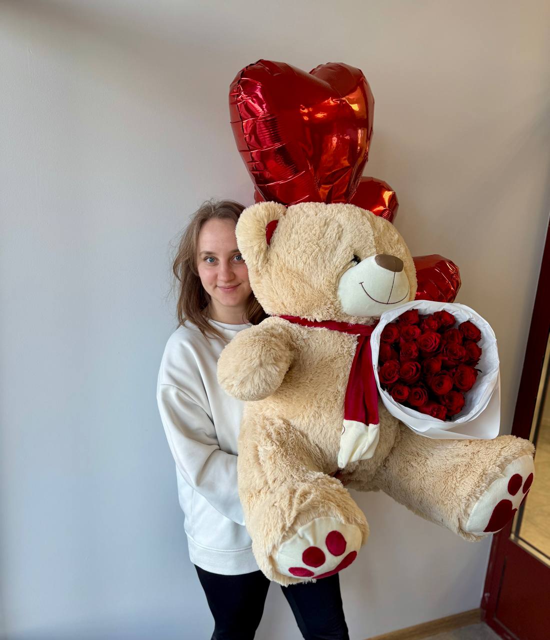 * Набор «Полный восторг»: Шикарный букет роз + большой плюшевый мишка + гелиевые шары-сердца. Беспроигрышный вариант для любимой девушки.